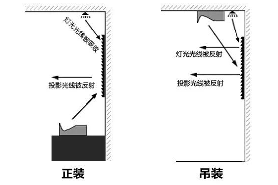 2 画面效果会有损失。吊装时,屏幕相应的也需要反装过来,这样投影的光线和顶部的灯光光线会同时被屏幕反射出来,造成光线的重叠,画面的色彩及对比度都会受到影响,看起来不够清晰!